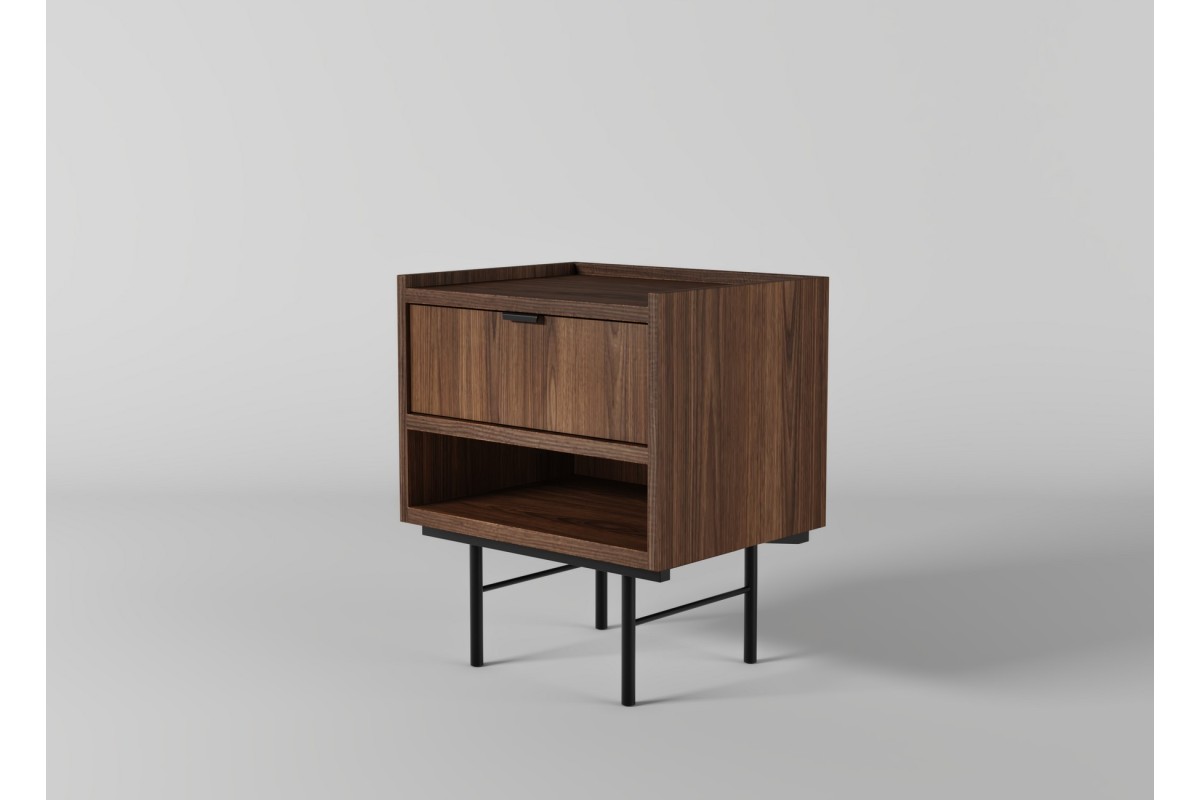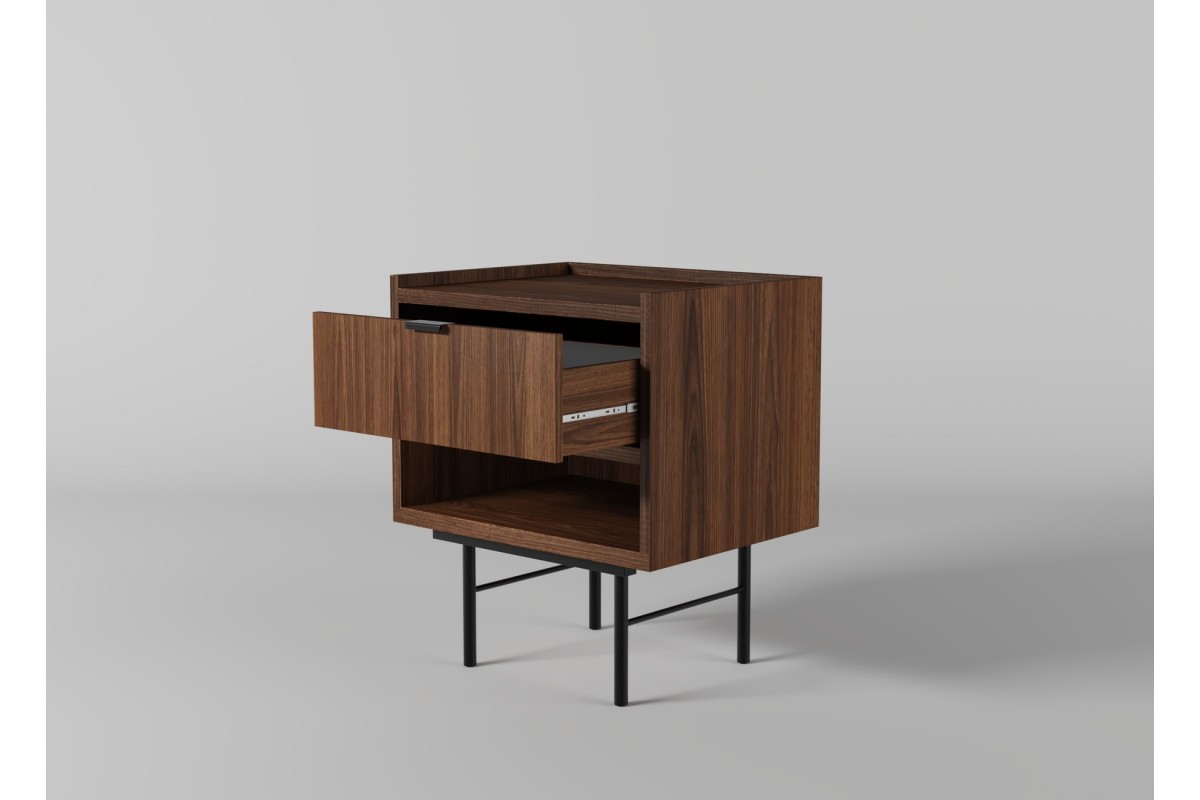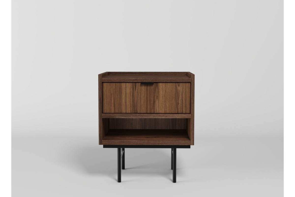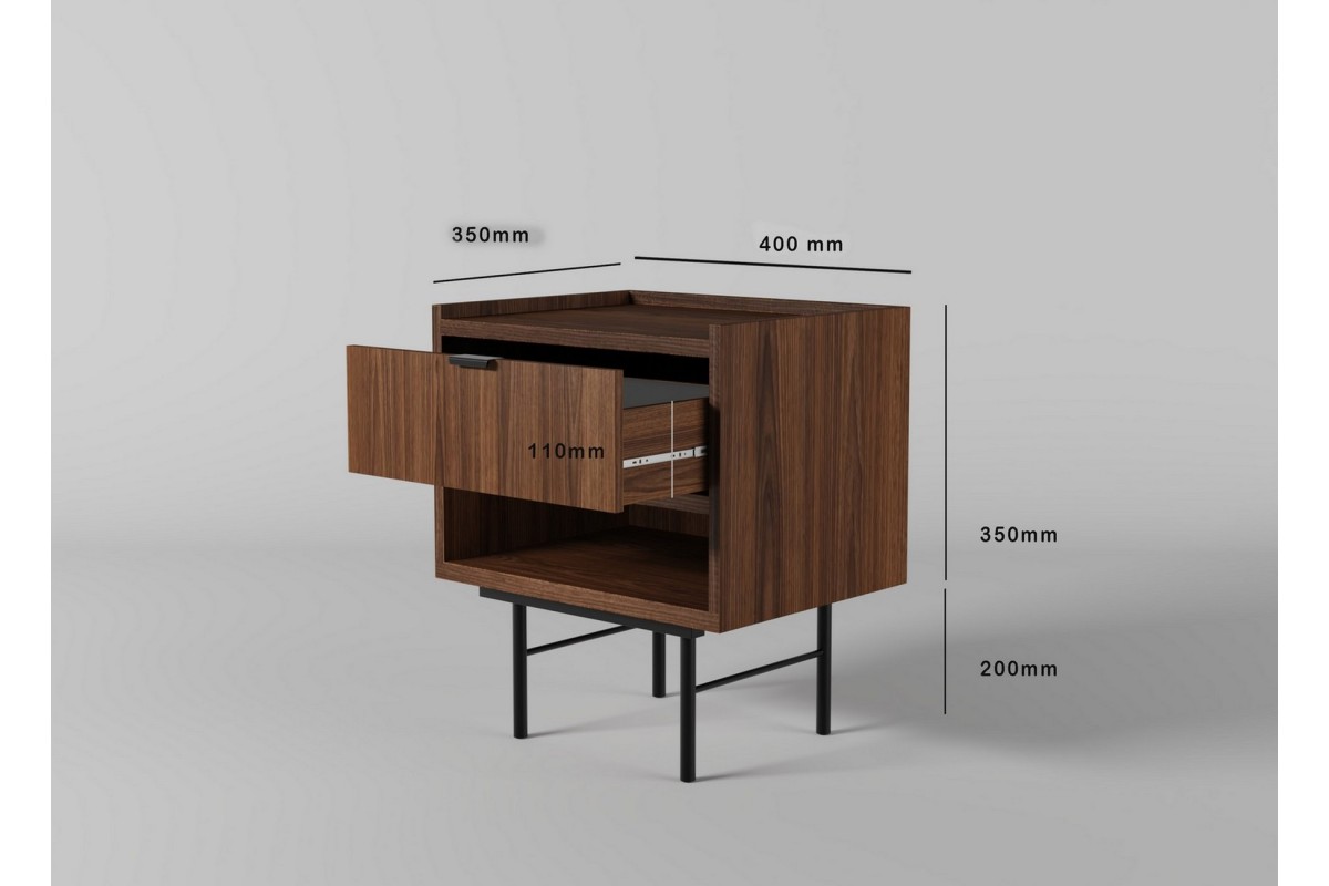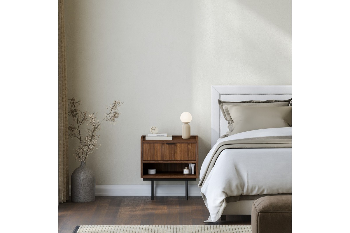 Stolik nocny EDSON to klasyczne i estetyczne uzupełnienie sypialni, w której liczy się porządek, wygoda i spokojny, ponadczasowy styl. Jego prosta, geometryczna forma osadzona na smukłych metalowych nóżkach sprawia, że mebel wygląda lekko i nie przytłacza przestrzeni przy łóżku, nawet w mniejszych wnętrzach.